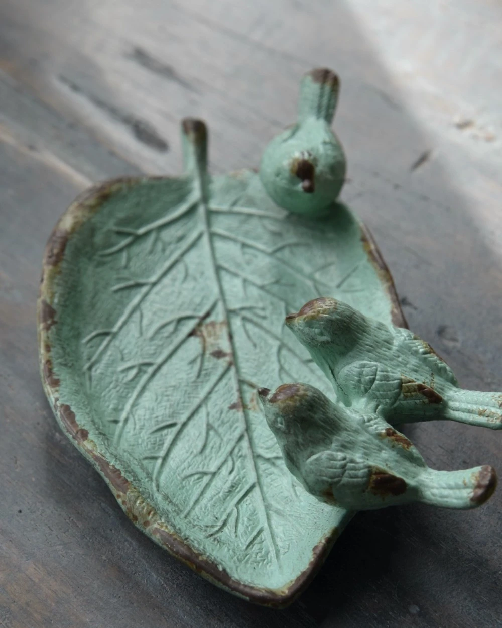 Blad Met 3 Vogeltjes Als Schaaltje In Antiek Turkoois