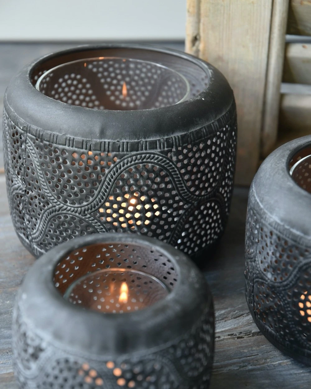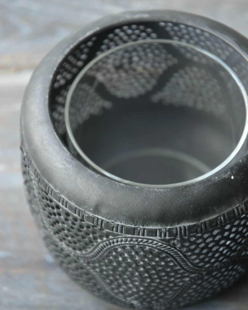 Bol windlicht met golvend rond gaatjes patroon, groot. Dit leuke windlicht is van metaal gemaakt met daarin een glas om de kaarsje veilig te kunnen branden. Het windlicht is donker met wat lichtere accenten die het mooie gaatjes patroon aangeven met zijn sierlijk golvende lijnen. Het windlicht is iets bol en in drie maten verkrijgbaar, waarvan dit de grootste maat is.