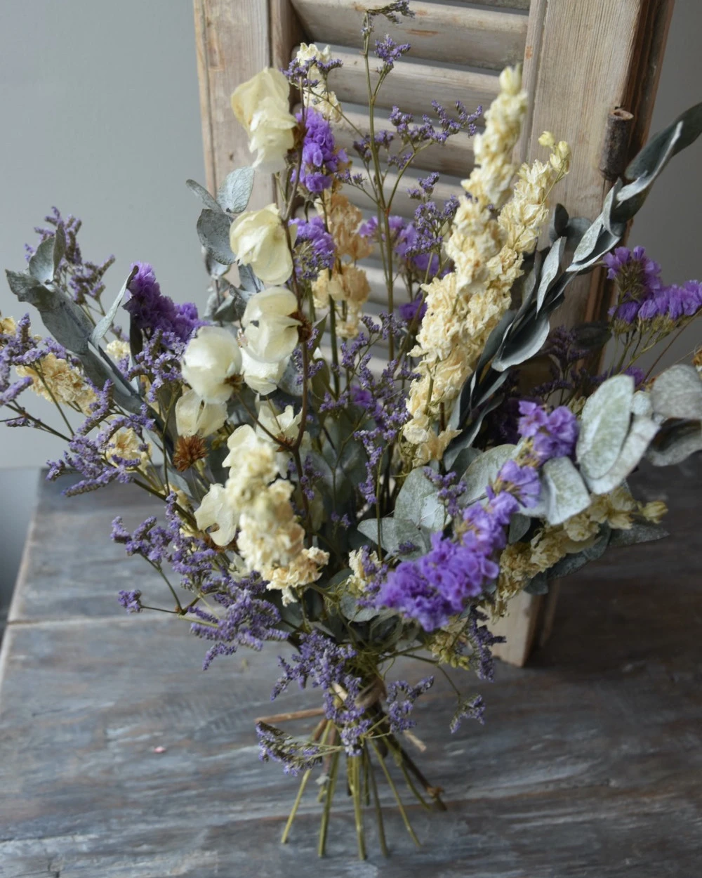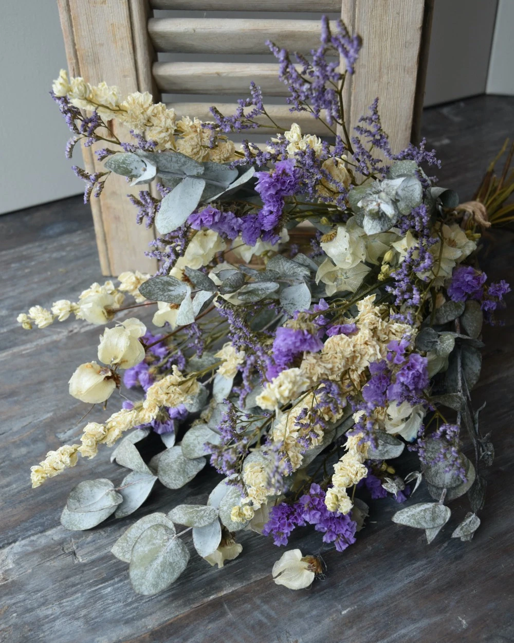 Droogbloemen boeket met o.a. Bougainvillea en Eucalyptus in het Lila, crème grijs. Dit gemengde boeket is in prachtige tinten lila, crème en grijs/groen. In het boeket zit o.a. Bougainvillea, Eucalyptus, Riddersporen, Limonium en Statice. U kunt het boeket zo in een vaas of pot zetten. Het boeket is zo bijzonder door de gebruikte gedroogde bloemen zoals de Bougainvillea en de prachtige lila tinten van de Limonium en de Statice.