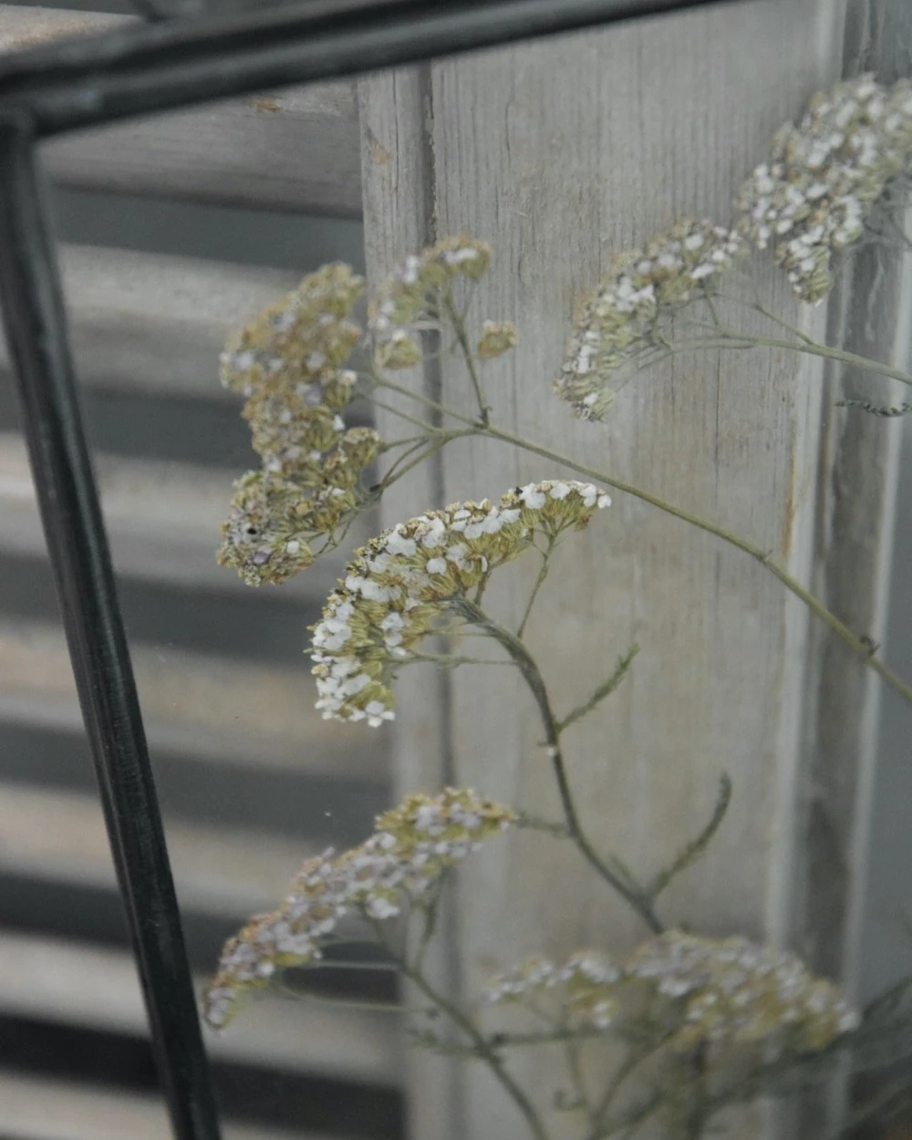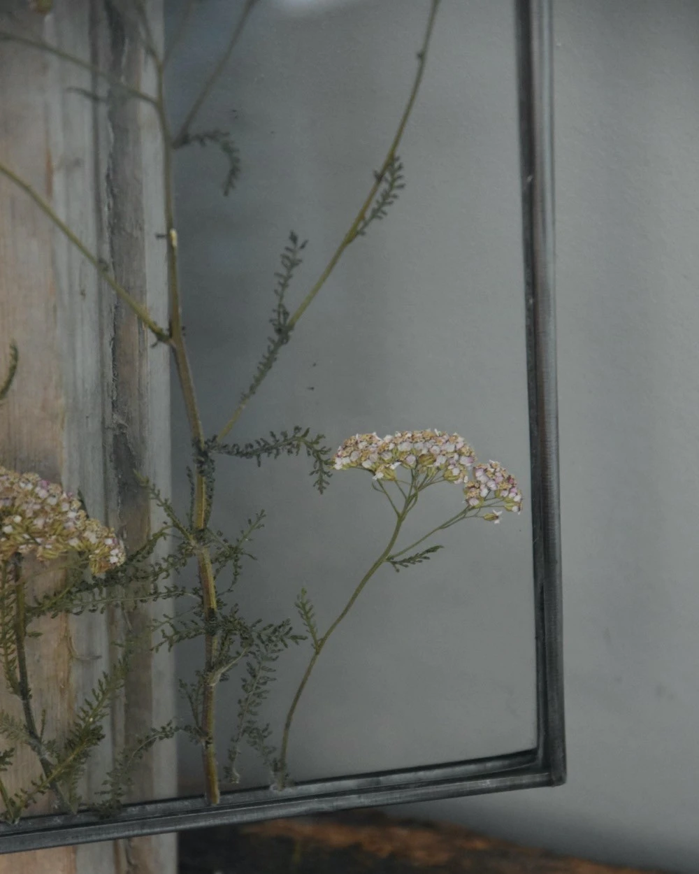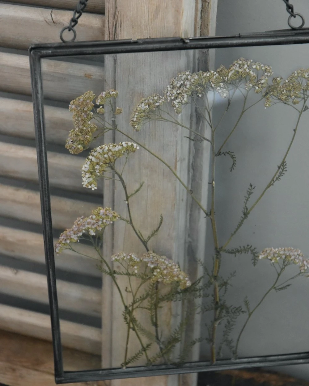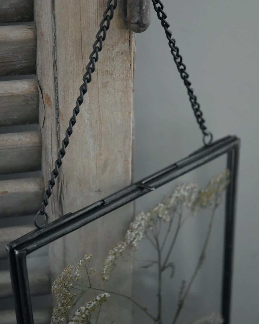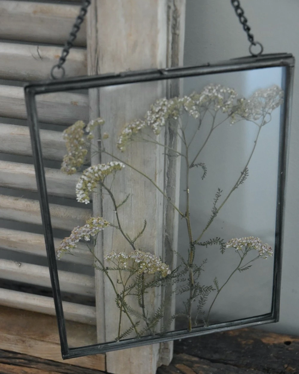 Geperste Schermbloemen in een lijst met kettinkje. Deze prachtige geperste Schermbloemen hebben een prachtige lichte kleur. De grote lijst is gevuld met geperste Schermbloemen in bloei en in de knop met wat blad. De lijst is van metaal met glas waar een kettinkje aan zit om de lijst mee op te hangen.