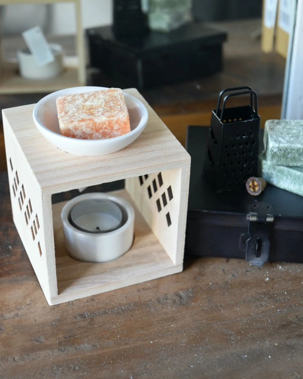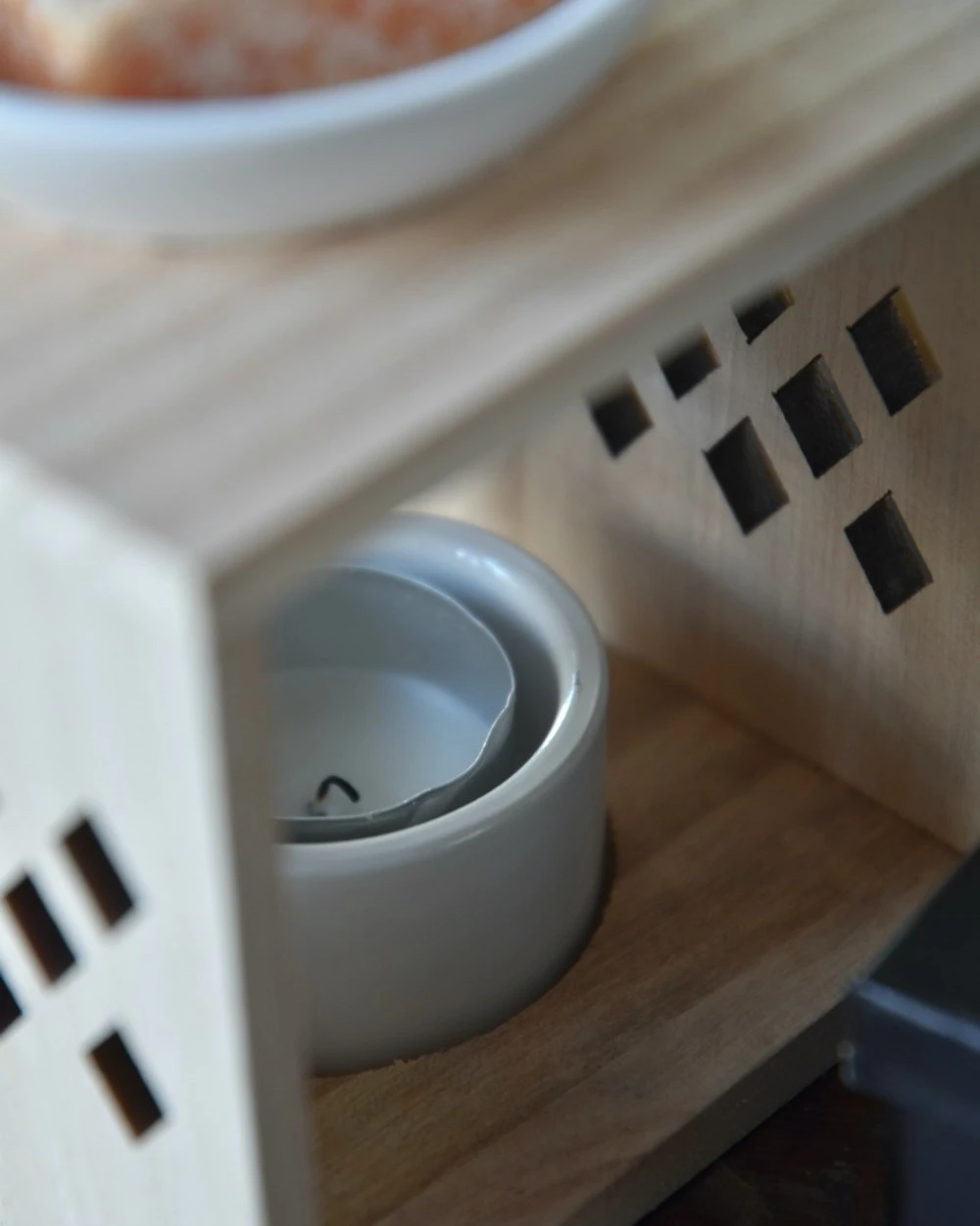 Geur brander hout met keramiek schaaltjes. Deze leuke geurbrander is in een kubus model en van naturel hout gemaakt met twee keramiek schaaltjes voor het waxinelichtje en voor een amber blokje. Aan de zijkanten van de brander zit een ruitvormige gaten patroon voor een sfeervol licht, wanneer er een amber blokje (of een stukje ervan) in het bovenste schaaltje wordt gelegd en gesmolten ontstaat er een heerlijke geur die nog intenser is. De brander is exclusief Amber blokje en waxinelichtje.