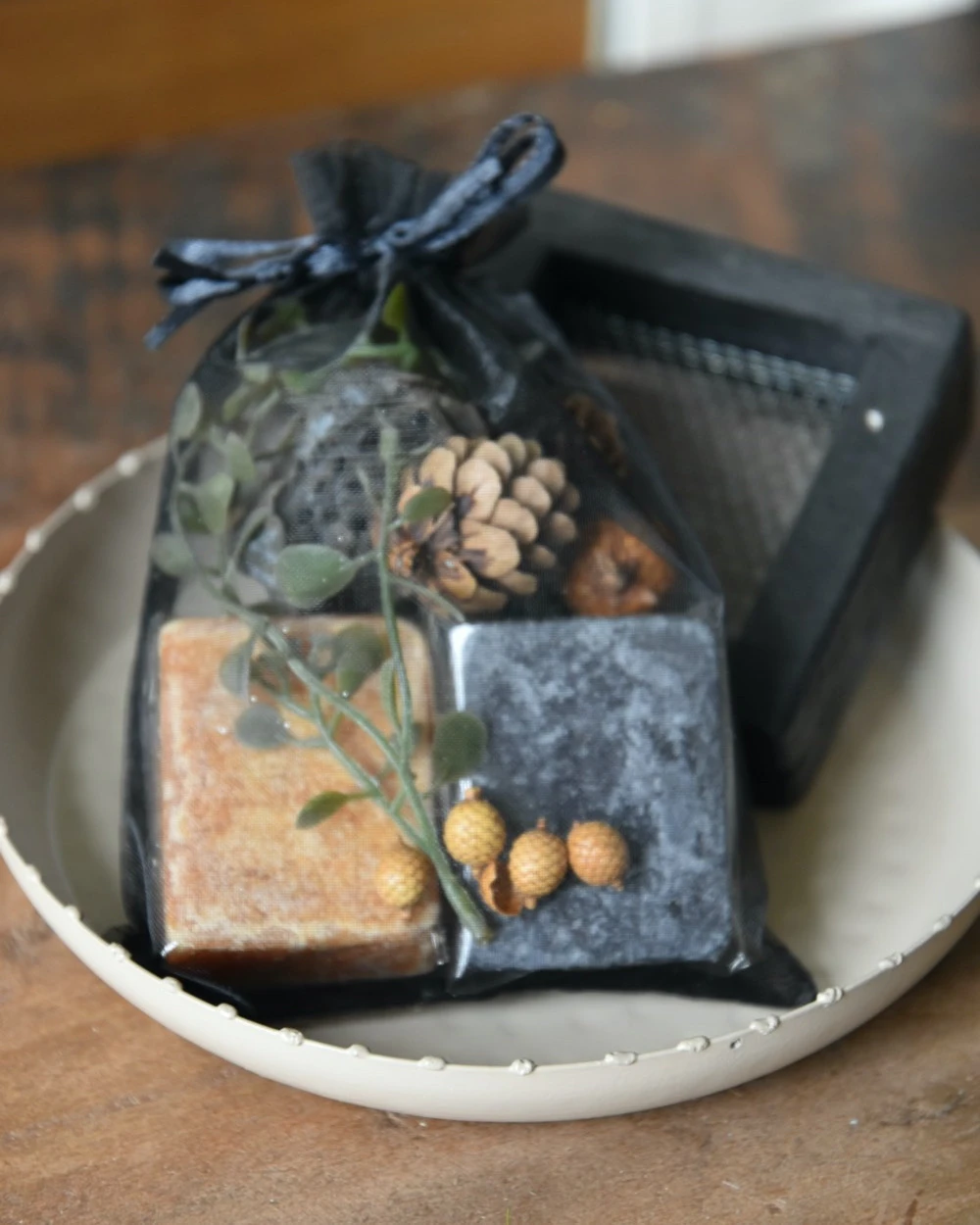 De Amber blokjes zitten per stuk in folie verpakt en zo samen met alle decoratie in het organza zakje, de rasp en het schaaltje zitten los (zie foto 2,4,6,8)