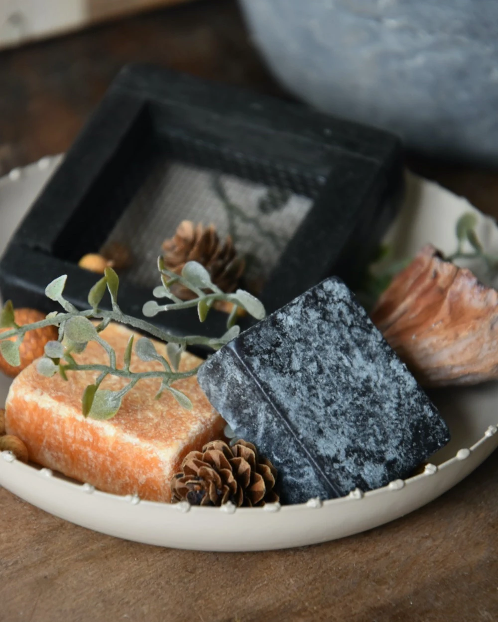 Geur-set twee Amber blokjes met schaaltje, rasp en decoratie. Dit leuke complete set van een taupe/zand kleurig metalen schaaltje, een zwarte retro rasp, een Amber blokje met Sandalwood geur, een Amber blokje met Musk geur en verschillende decoratie takjes en vruchten die het geheel afmaken (zit samen in een zwart organza zakje). Het complete set is ook erg leuk om cadeau te geven, vul dan de tekst voor het kaartje in en vergeet deze niet op te slaan. U kunt het gezellige geheel een mooi plekje geven. Wanneer de Amber blokjes iets minder zijn gaan ruiken kunt u er met de rasp een stukje afraspen om zo weer optimaal van de geur te genieten.