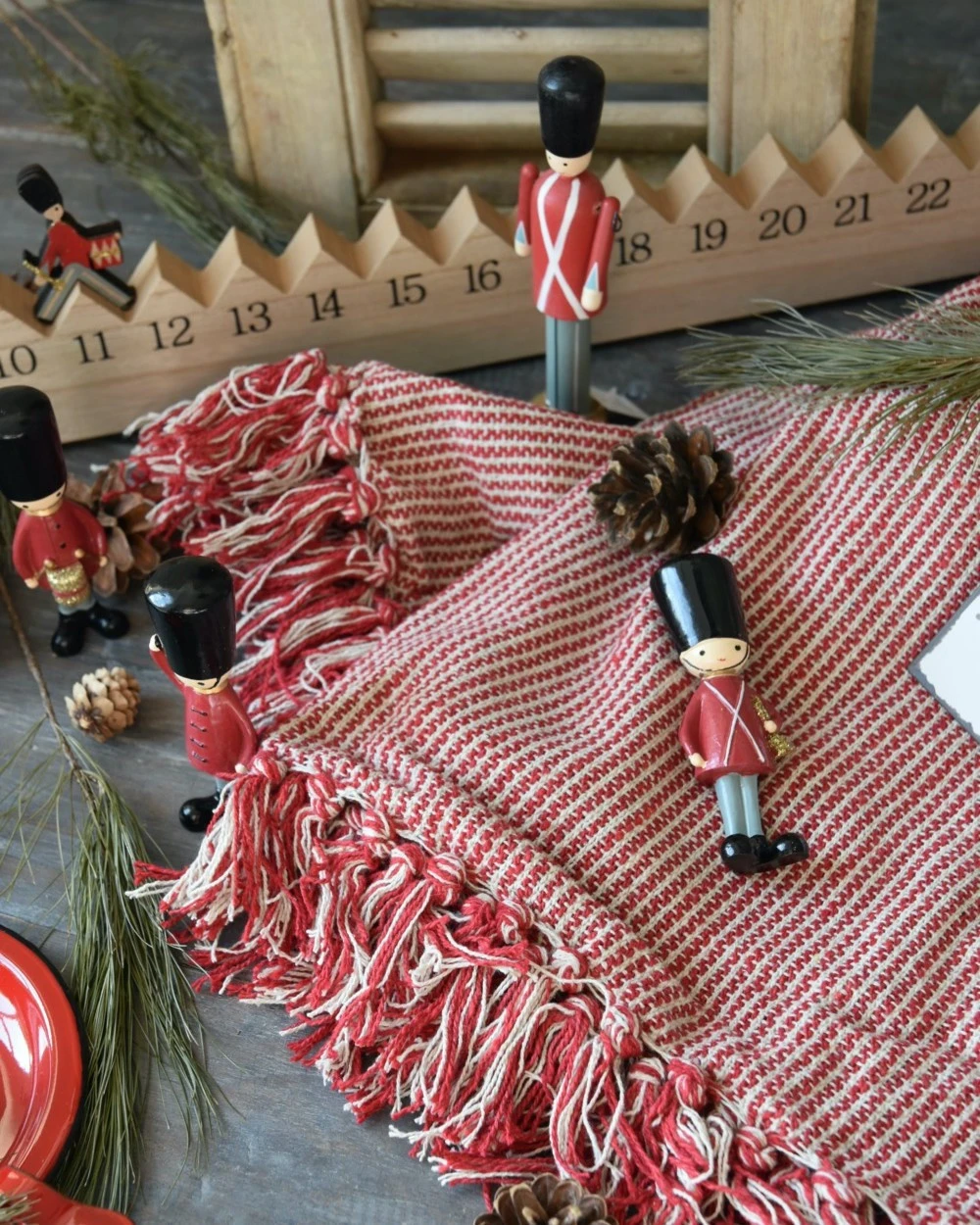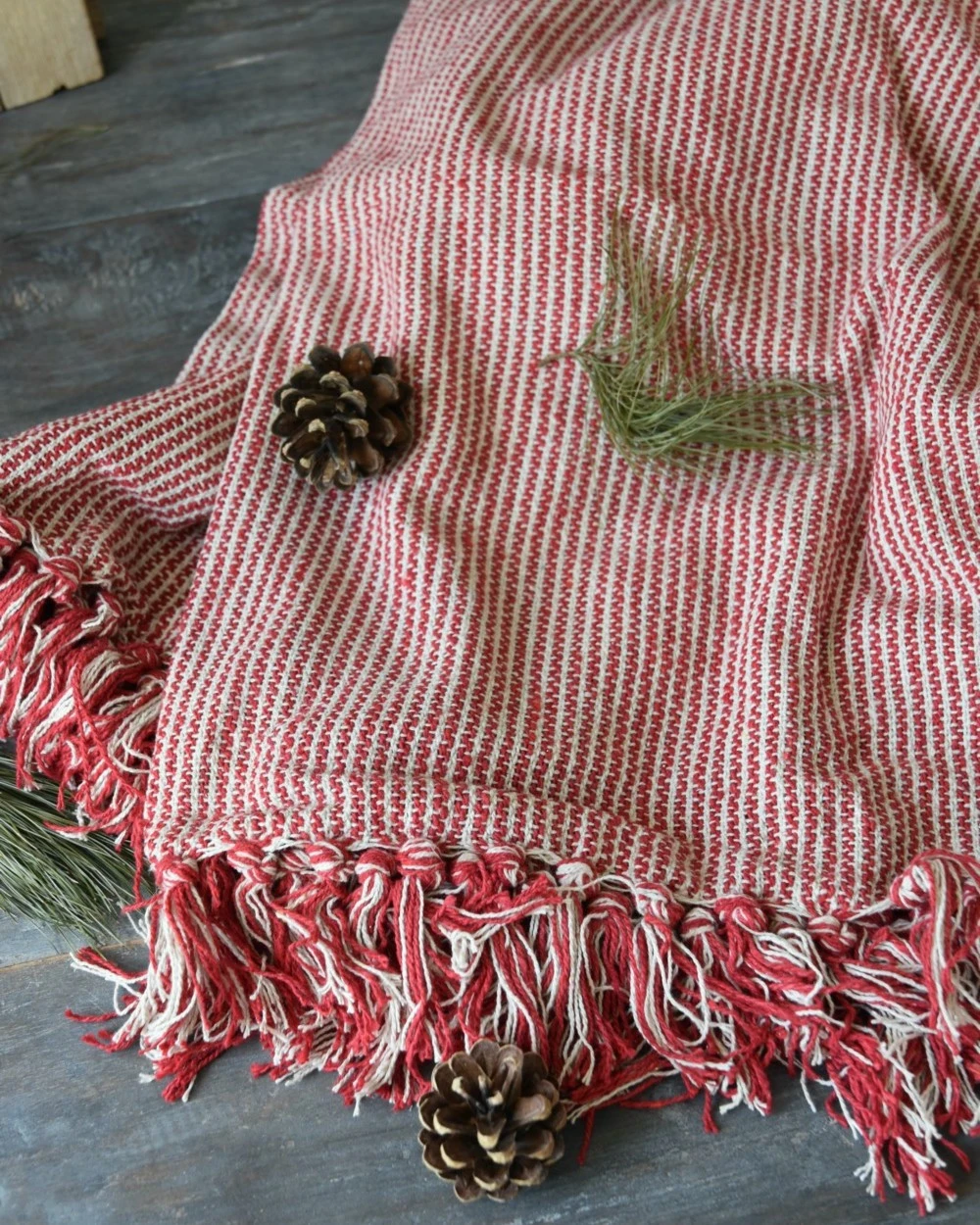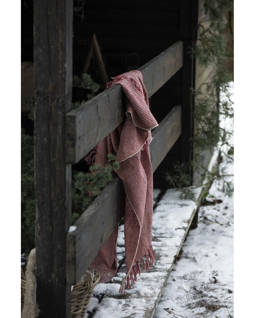 Geweven woonkleed/ sprei gebroken wit met fijne rode strepen, IB Laursen. Dit leuke woonkleed ofwel sprei heeft een mooi geweven patroon van strepen in het rood en gebroken wit met kwastjes aan de boven en onderkant. Het kleed geeft een mooie rijke kleur en sfeer in uw woning over een bank of stoel, in een grote mand gedrapeerd of buiten over een stoel. Ook is het een leuk kleed om over het uiteinde van een bed te draperen. De rode kleed kan eigenlijk het gehele jaar worden gebruikt.