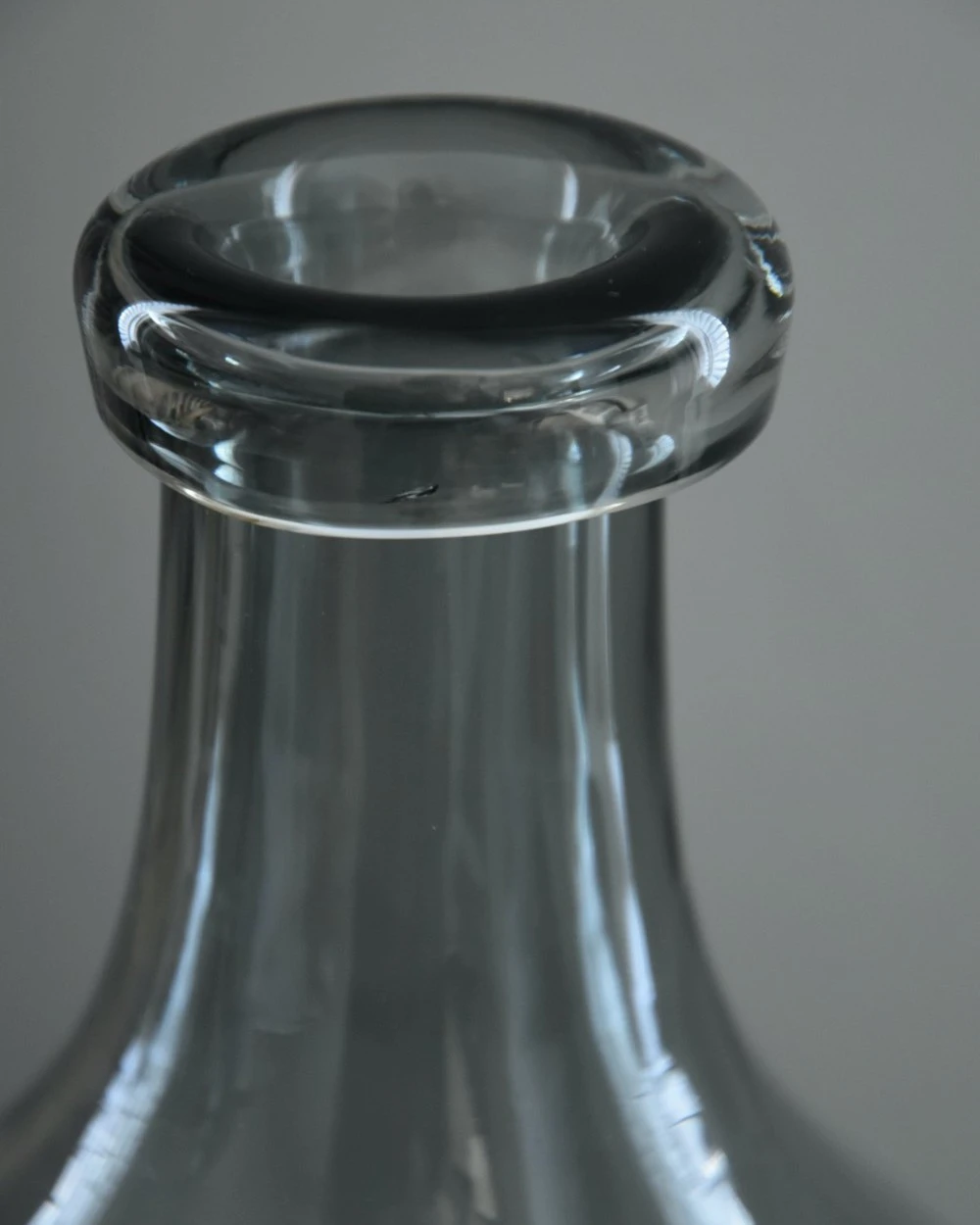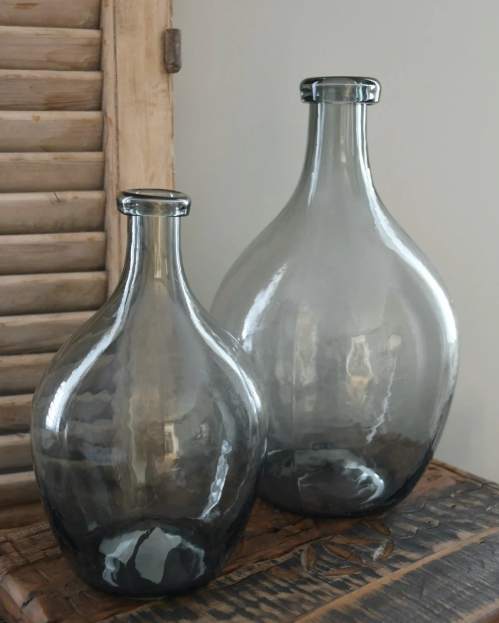Grote glazen ballon vaas met grijze gloed, IB Laursen per stuk. Deze prachtige vaas is mond geblazen en van mooi dik glas met een grijze gloed. Doordat deze vaas handgemaakt is is iedere vaas uniek met zijn eigen kenmerken. De malle hals de bolle buiken een omgevouwen opening maken een prachtig geheel. De vaas is al mooi genoeg van zichzelf maar er zouden ook een enkele pluim of tak in kunnen worden gezet. De vaas is ook in een kleinere maat verkrijgbaar.