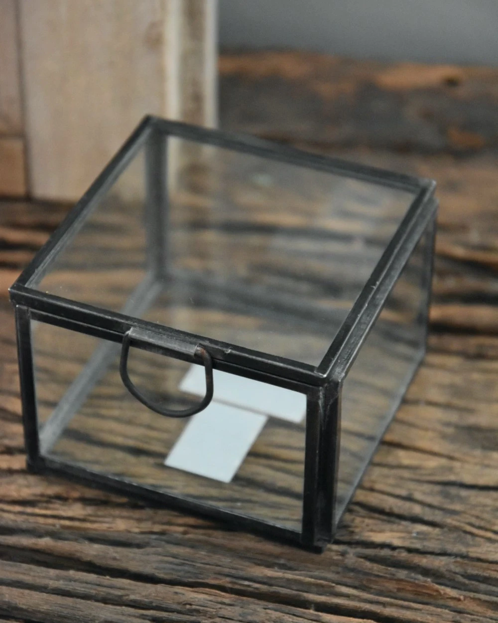 Glazen kistje vierkant, IB Laursen. Dit leuke kleine kistje is van metaal gemaakt en ingelegd met glazen wanden, bodem en deksel. Het kistje heeft een scharnierdeksel met een rond oog om hem mee te openen. U kunt het kistje naar wens vullen met bv gevriesdroogde bloemen een mooi sierraad of iets anders waar u veel waarde aan hecht om het zo een bijzonder plekje te geven. Doordat er met de hand het glas is ingelegd kunnen er kleine oneffenheden in het kistje zijn, dit hoort bij de charme van het product.