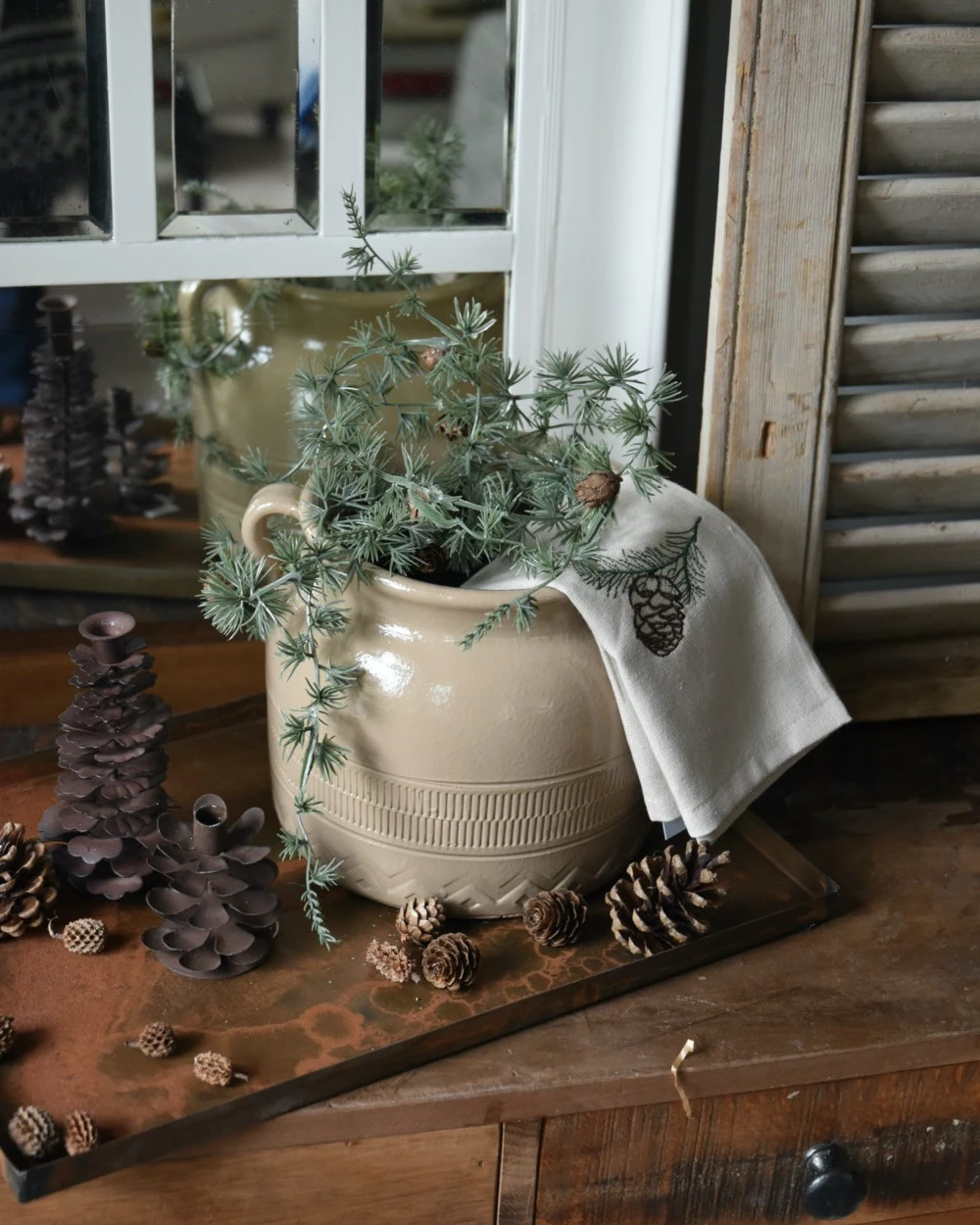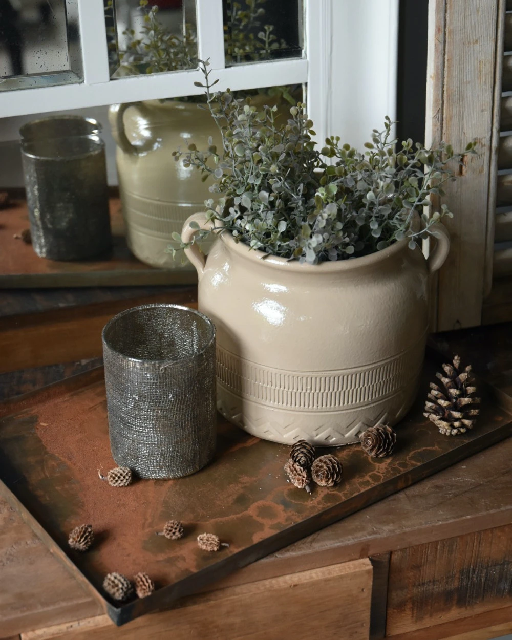 Gres pot met patroon in onderrand en oren, IB Laursen. Deze prachtige handgemaakte pot heeft een mooie klei kleur een beetje een linnen tint. De pot is van hoge kwaliteit en heeft een prachtige gewerkte onderrand met een patroon met een klein ruitje, een zigzag en een twee verticale randen. De pot heeft twee kleine oren en een brede kraag. De pot is mooi afgewerkt en iets glanzen. Een nieuwe pot in een ‘oude’ tijdloze look.