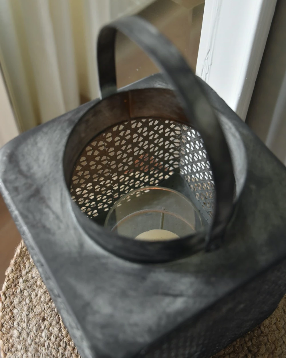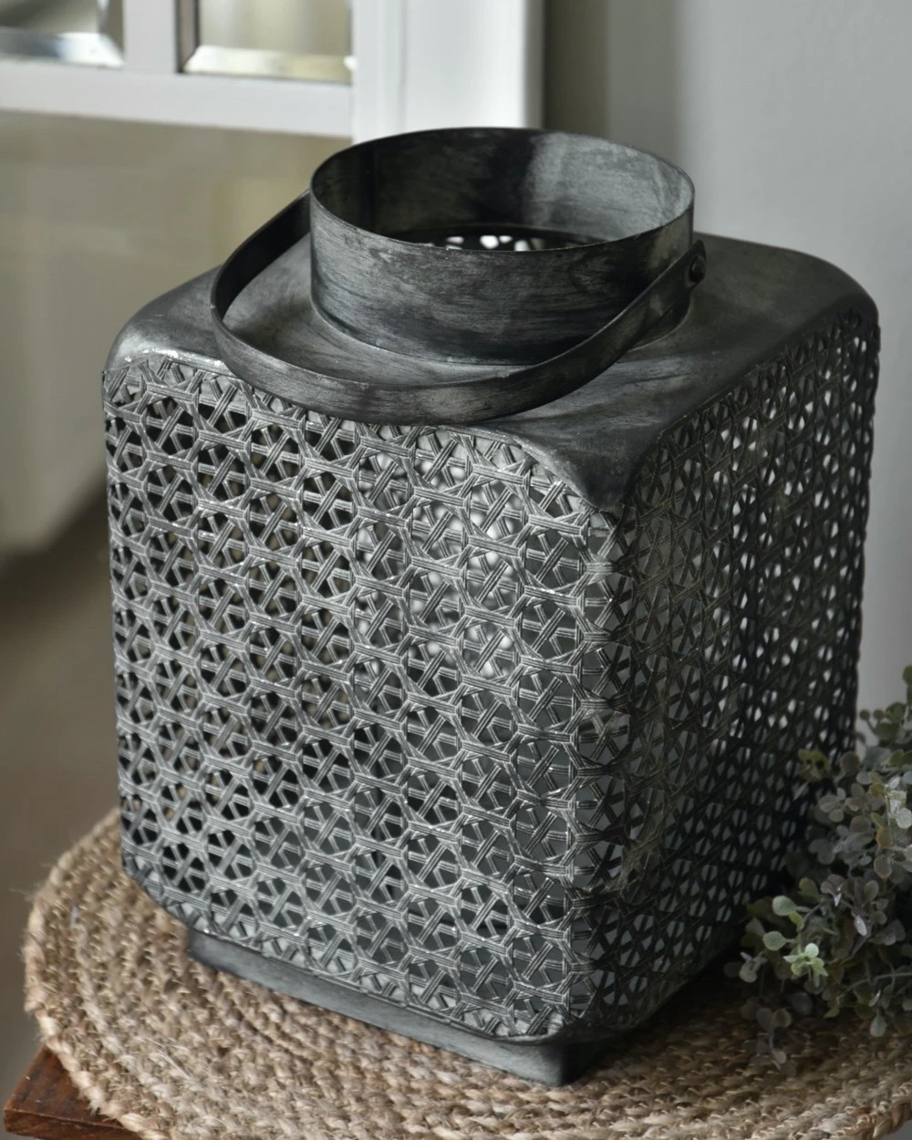 Groot metalen windlicht met weefpatroon en hengsel, vierkant. Dit mooie grote windlicht is van metaal met een mooi soort weefpatroon waartussen open gaatjes zitten waardoor het schijnsel van de kaars een mooi effect geeft. Het model is vierkant met van boven een ronde opening met hengsel. In het windlicht zit een houder waarin een cilinderglas staat waardoor de kaars minder last heeft van wind en mooi blijft branden. Het metaal heeft een ietwat donkere afwerking met lichtere poederachtige accenten die het patroon benadrukken en zo het geheel tot een prachtige groot windlicht maakt.