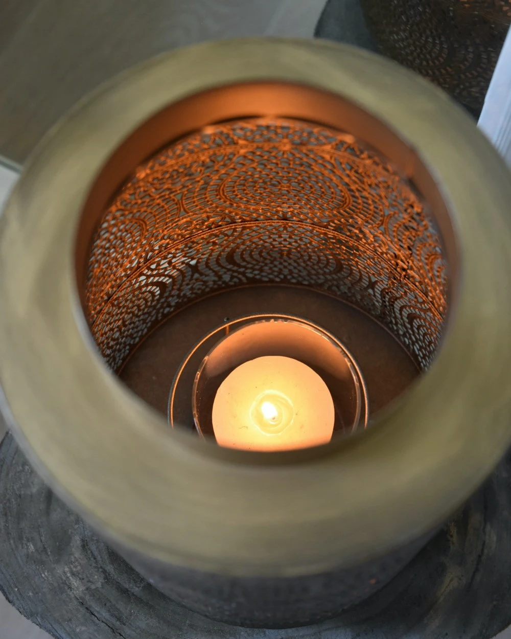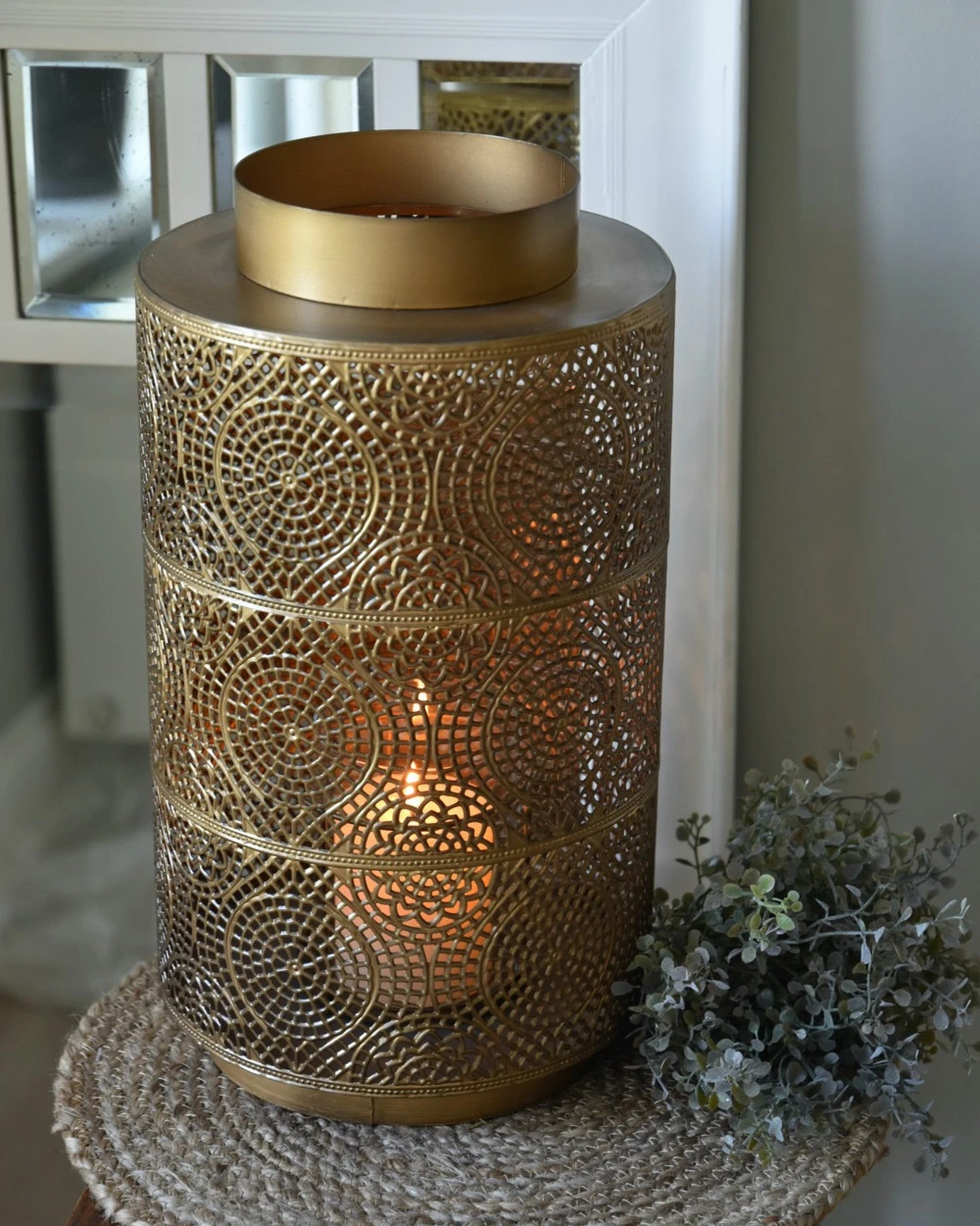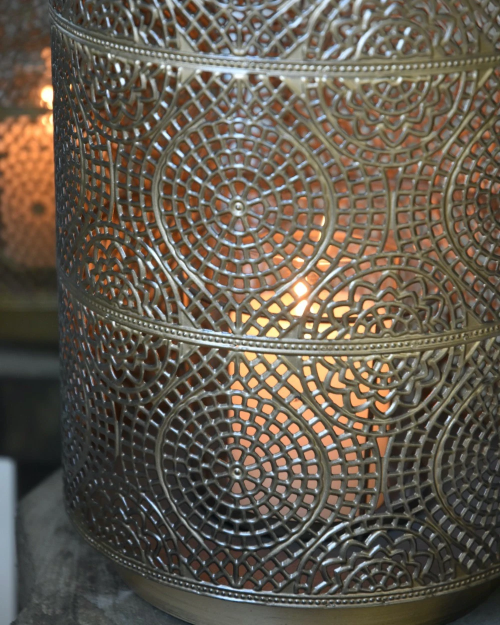 Groot windlicht met sfeervol gaatjes patroon antiek-look messing. Dit grote hoge windlicht is van metaal gemaakt en heeft een antiek-look messing afwerking. Het windlicht is rond als een recht opgaand model waar een sierlijk patroon met gaatjes waardoor het licht een mooi schijnsel geeft. In het windlicht zit een houder en een glas waarin er veilig een kaars gebrand kan worden.