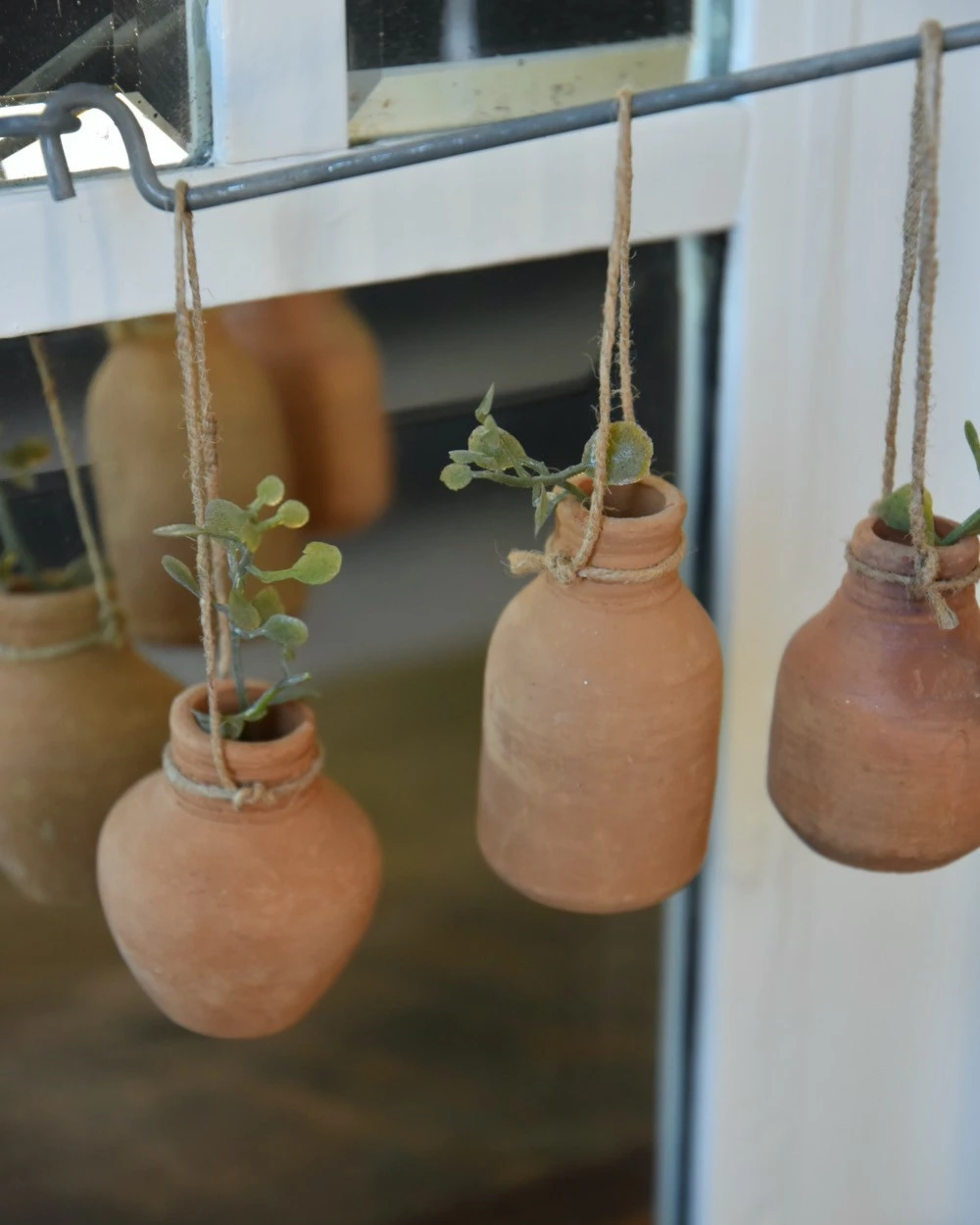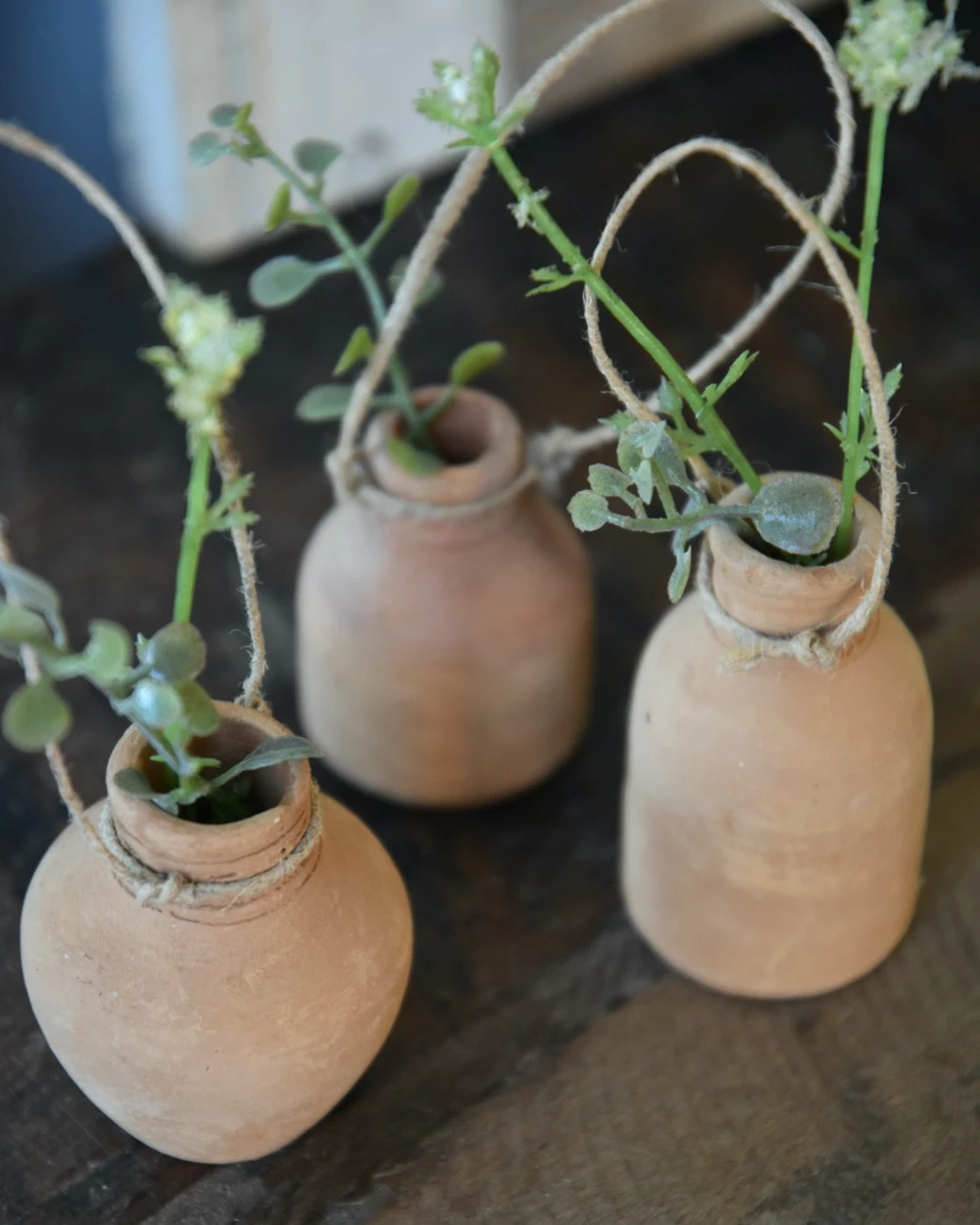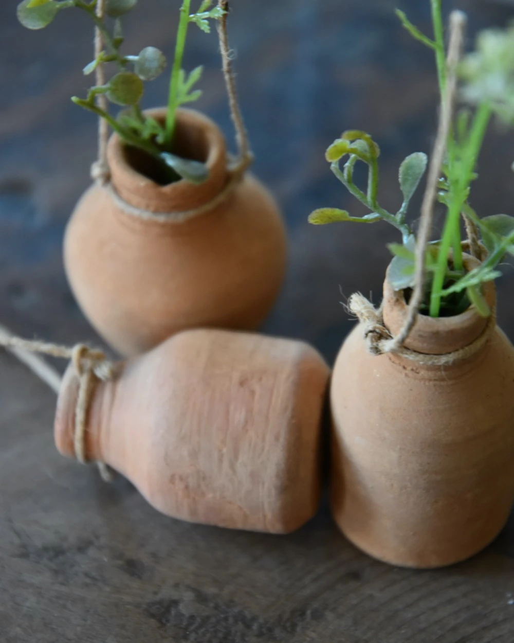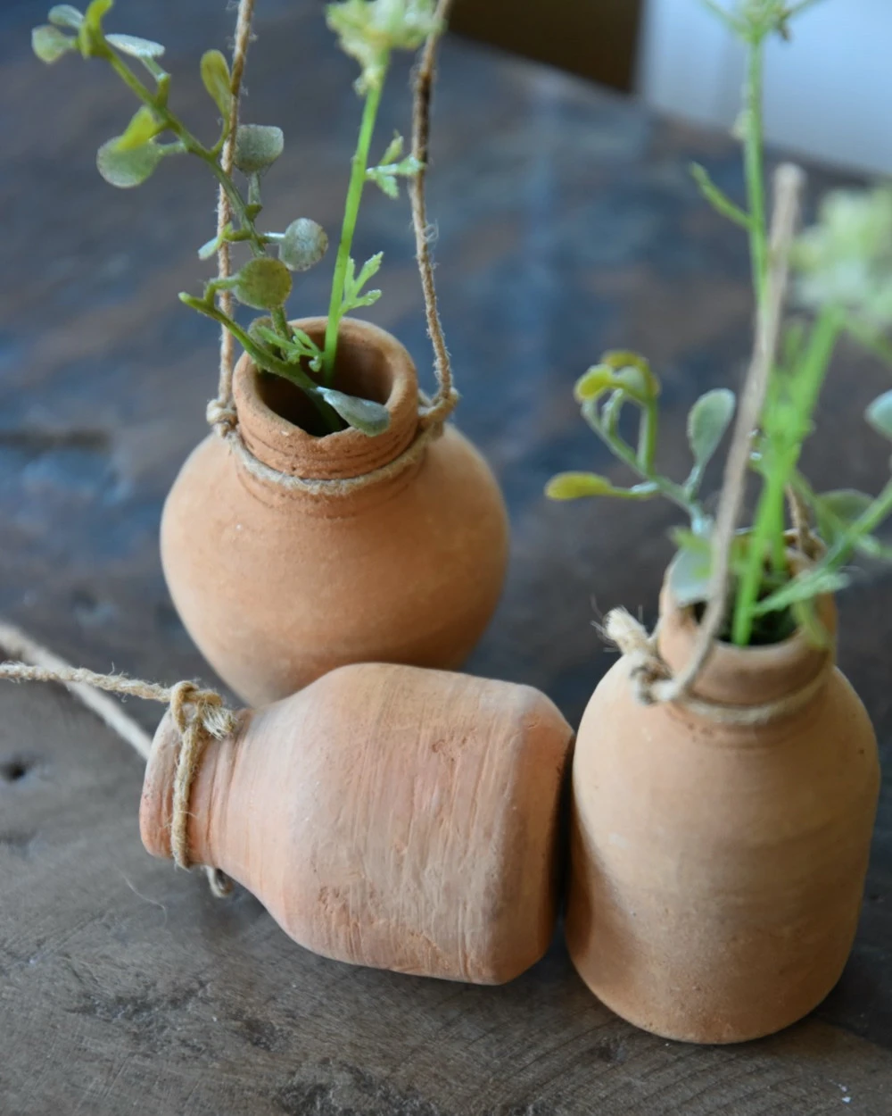 Handgemaakte aardewerk flesjes met ophang touw set van 3, IB Laursen. Deze leuke handgemaakte flesjes van rood stenen aardewerk zijn een set van drie en hebben elk hun eigen modelletje. Iedere flesje heeft een touwtje/koordje waarmee hij eventueel kan worden opgehangen aan een leuk rekje, of worden neergezet op een leuk plateau of in een vetplanten bakje… De flesjes zijn met de hand gemaakt en daardoor uniek in uiterlijk, de flesjes zijn niet waterdicht en exclusief inhoud (takjes groen).
