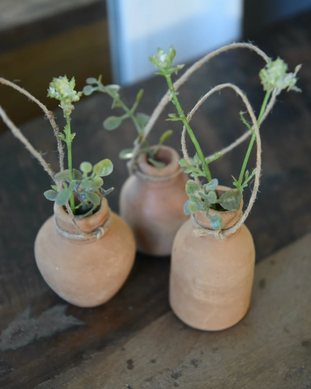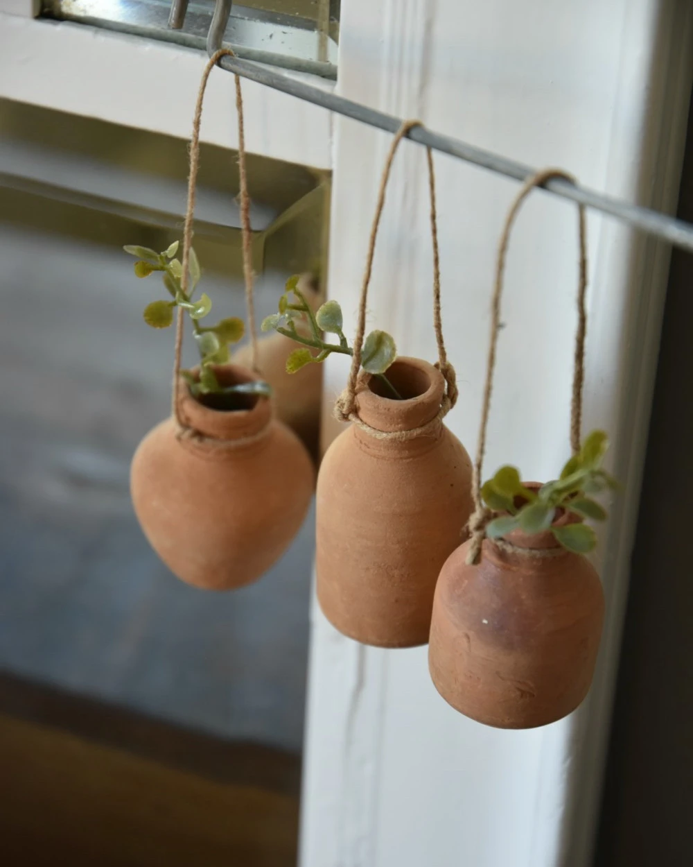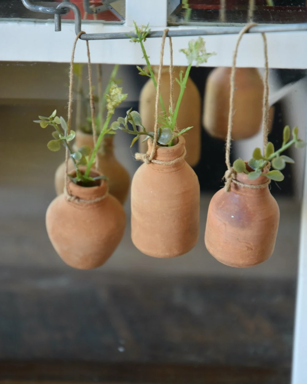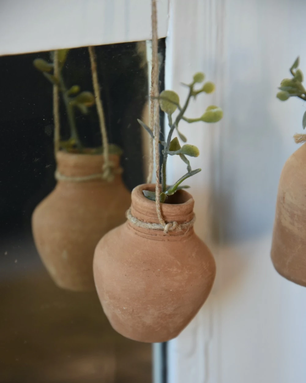 Handgemaakte aardewerk flesjes met ophang touw set van 3, IB Laursen. Deze leuke handgemaakte flesjes van rood stenen aardewerk zijn een set van drie en hebben elk hun eigen modelletje. Iedere flesje heeft een touwtje/koordje waarmee hij eventueel kan worden opgehangen aan een leuk rekje, of worden neergezet op een leuk plateau of in een vetplanten bakje… De flesjes zijn met de hand gemaakt en daardoor uniek in uiterlijk, de flesjes zijn niet waterdicht en exclusief inhoud (takjes groen).