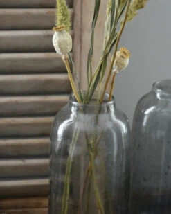 Hoge vaas met bubbels, zilvermetaal en grijze gloed per stuk. Deze leuke glazen vaas heeft een recht opgaand hoog model met een afgeronde iets smallere hals. Het glas is transparant met een grijze gloed en een mooi effect van bubbels en zilvermetaal in het glas verwerkt. De vaas staat heel mooi met enkele takken of droogbloemen die leuk te combineren zijn met wat schelpen en takjes op de bodem van de vaas.