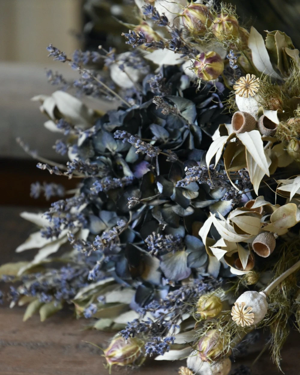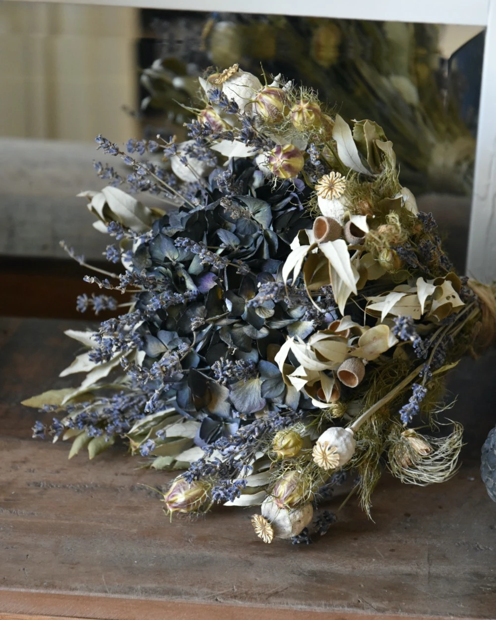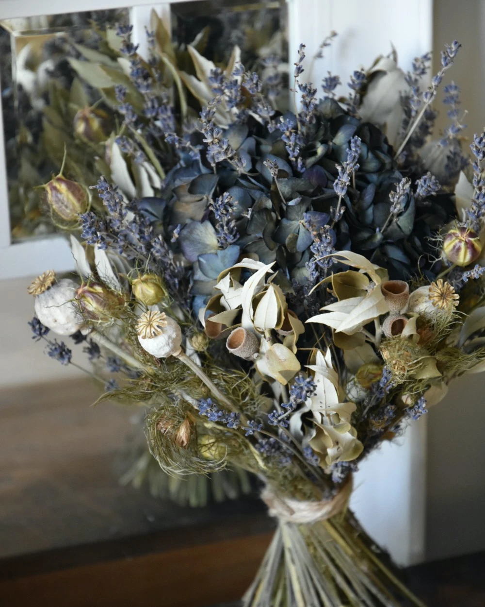 Lavendel Hortensia biedermeier droogbloemen boeket. Dit mooie compacte droogbloem boeket heeft als hart een Hortensia die gevuld is met Lavendel en omringd wordt met Juffertjes, Steeneik, Papavers en nog meer Lavendel. Het boeket is in mooie tinten grijzig groen, blauwen en naturellen. Het boeket is gebonden met touw wat ook het model behoud. U kunt de biedermeier zo op een vaas of pot zetten of neerleggen.