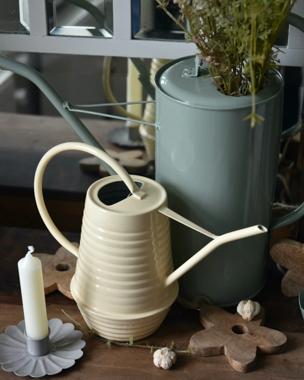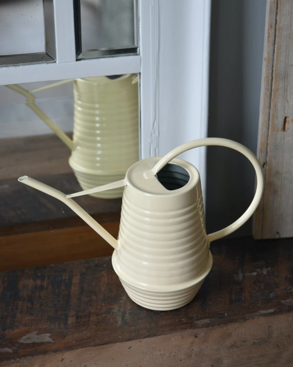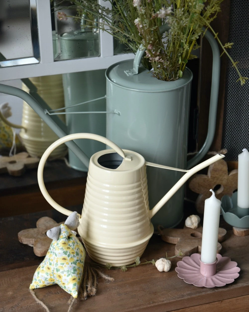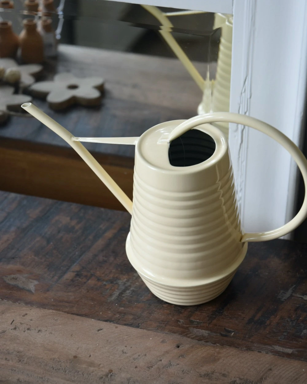 Metalen gieter in zacht geel 0.95 liter, IB laursen. Deze leuke kleine gieter is van metaal met een zacht gele kleur in een erg leuk model waar een lijnenspel in verwerkt zit. De gieter heeft een smal groot handvat en een smalle water tuit. U kunt de gieter ook gemakkelijk binnen gebruiken voor de kamerplanten. Ook is het leuk om er wat bloementakken in te zetten bijvoorbeeld. Tip, laat nadat u de planten water gegeven heeft geen water in de gieter staan, zo voorkomt u roest, algen-groei en bacterie-groei.