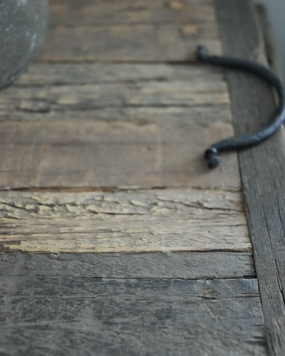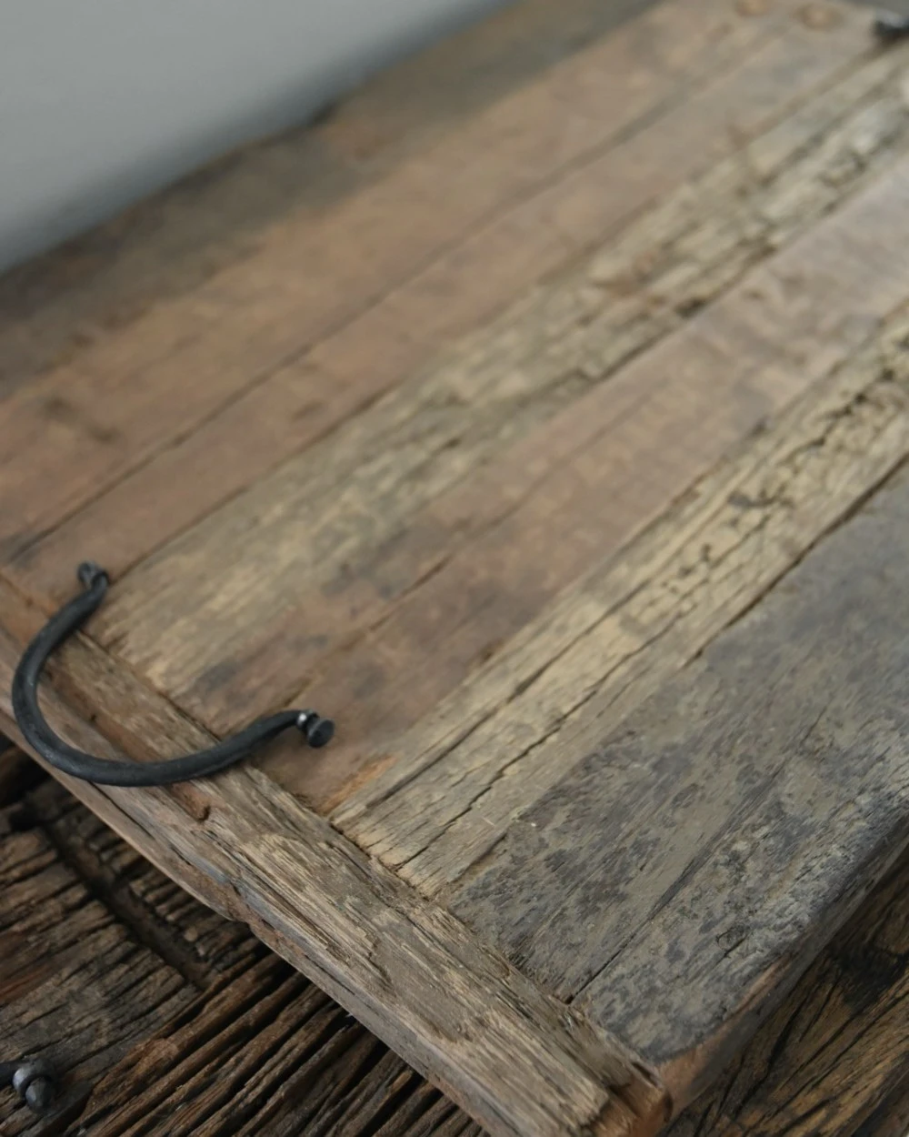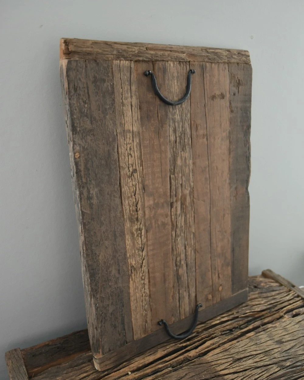 Oud houten railway plateau met hengsels. Dit prachtige houten plateau is gemaakt van oude spoorweg delen, daardoor heeft het een uniek uiterlijk. Aan de ondezijde zijn twee latjes geplaatst waardoor het geheel iets omhoog komt en extra diepte geeft. Aan de bovenzijde zijn twee smeedijzeren hengsels bevestigd voor een mooie finishing touch. U kunt met dit prachtige plateau eindeloos decoreren.