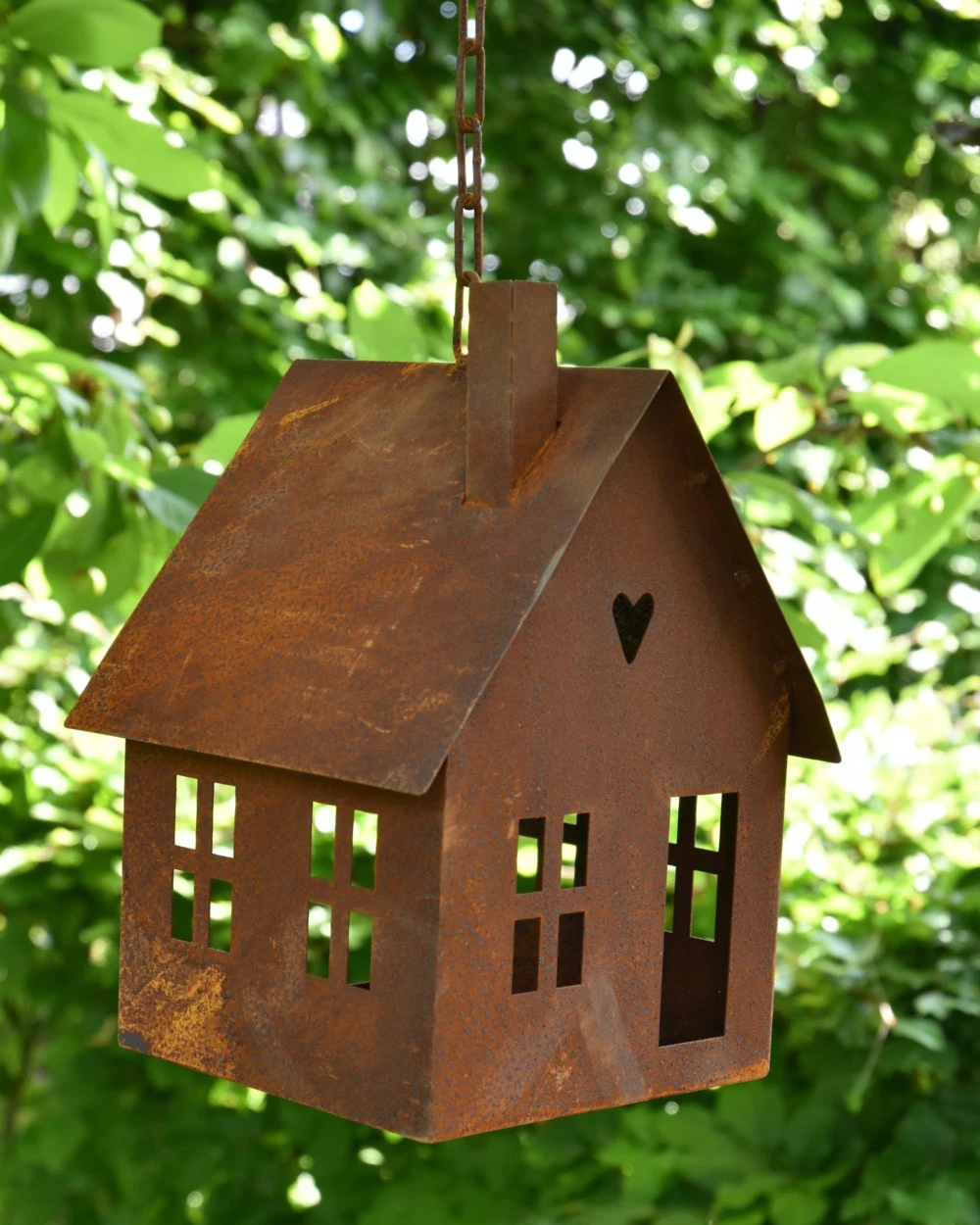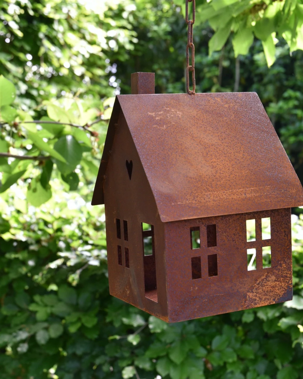 Vogel voeder huisje van roest metaal aan ketting. Dit leuke huis van metaal hangt aan een ketting met haak om op te hangen, het huis heeft ramen een dak, schoorsteen en een hartje in de top. Aan de achterzijde zit een ruim gat waar de vogeltjes gemakkelijk in kunnen om zo het ‘strooivoer’ wat in het huisje ligt gezellig op te eten met voor de vogels uitzicht door de open ramen….