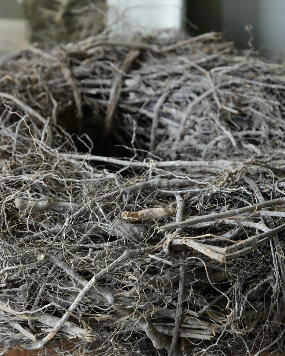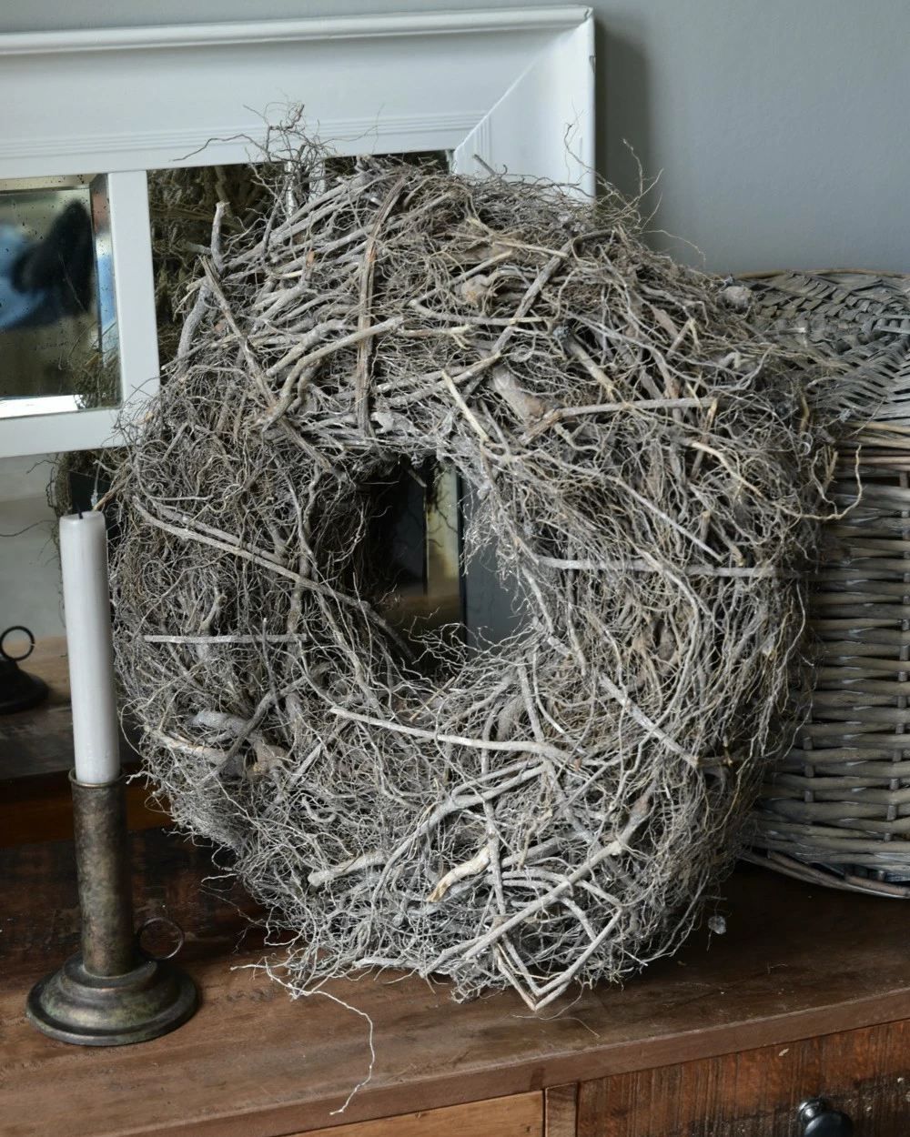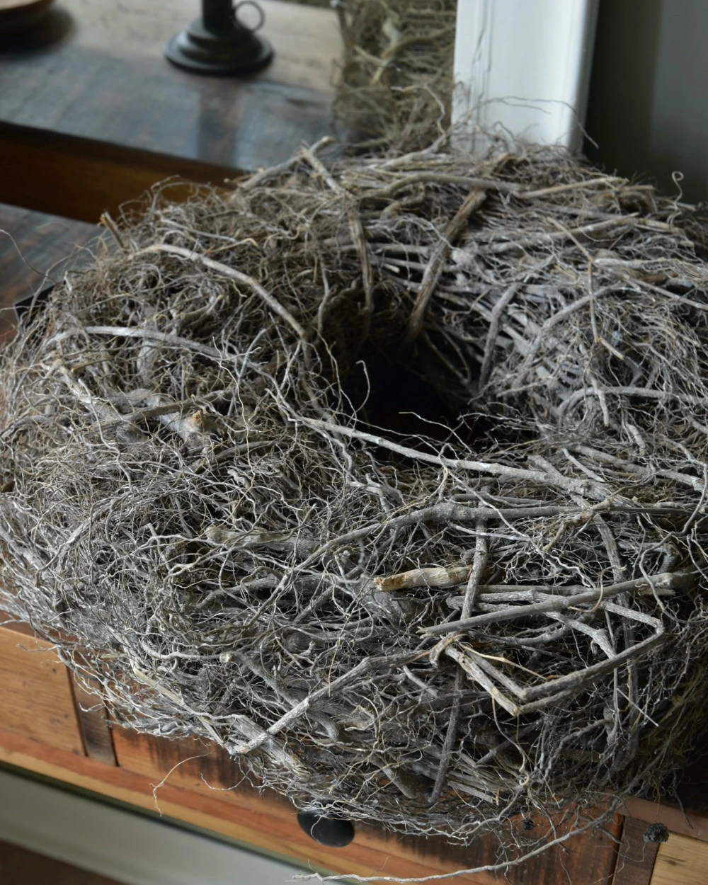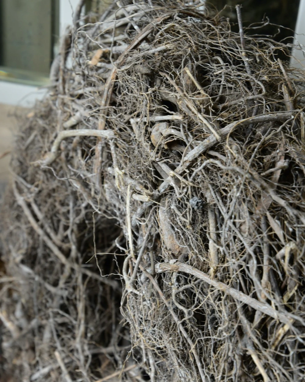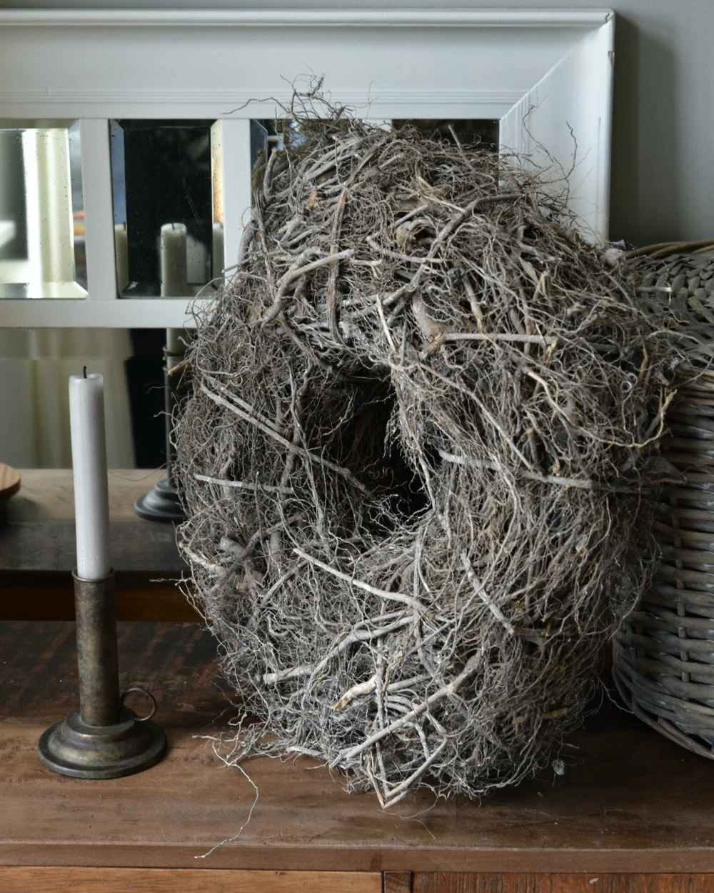 White wash krans van takken en wortels. Deze volle krans van takken met fijne wortels eraan heeft een subtiele white-wash gekregen. Hierdoor is de krans een beetje wit grijzig. De krans is vol en dik opgebonden wat een mooi effect geeft. U kunt de krans mooi ophangen of neerzetten op een kast bijvoorbeeld.