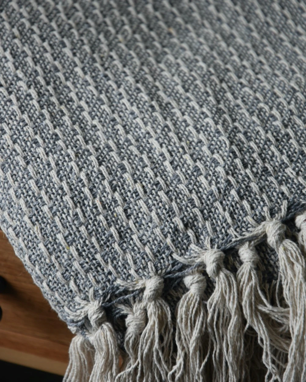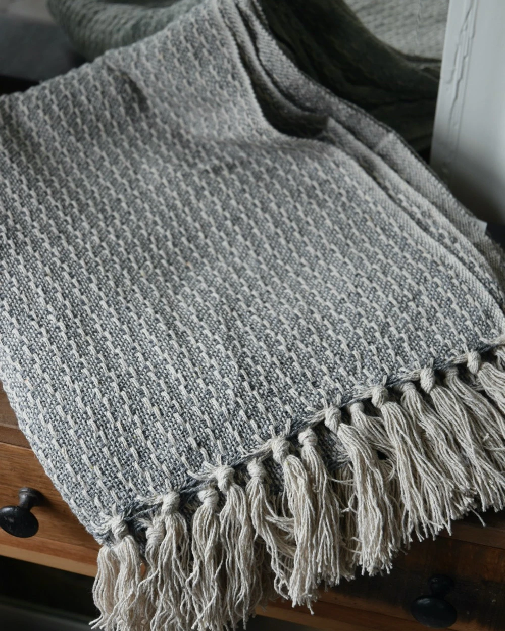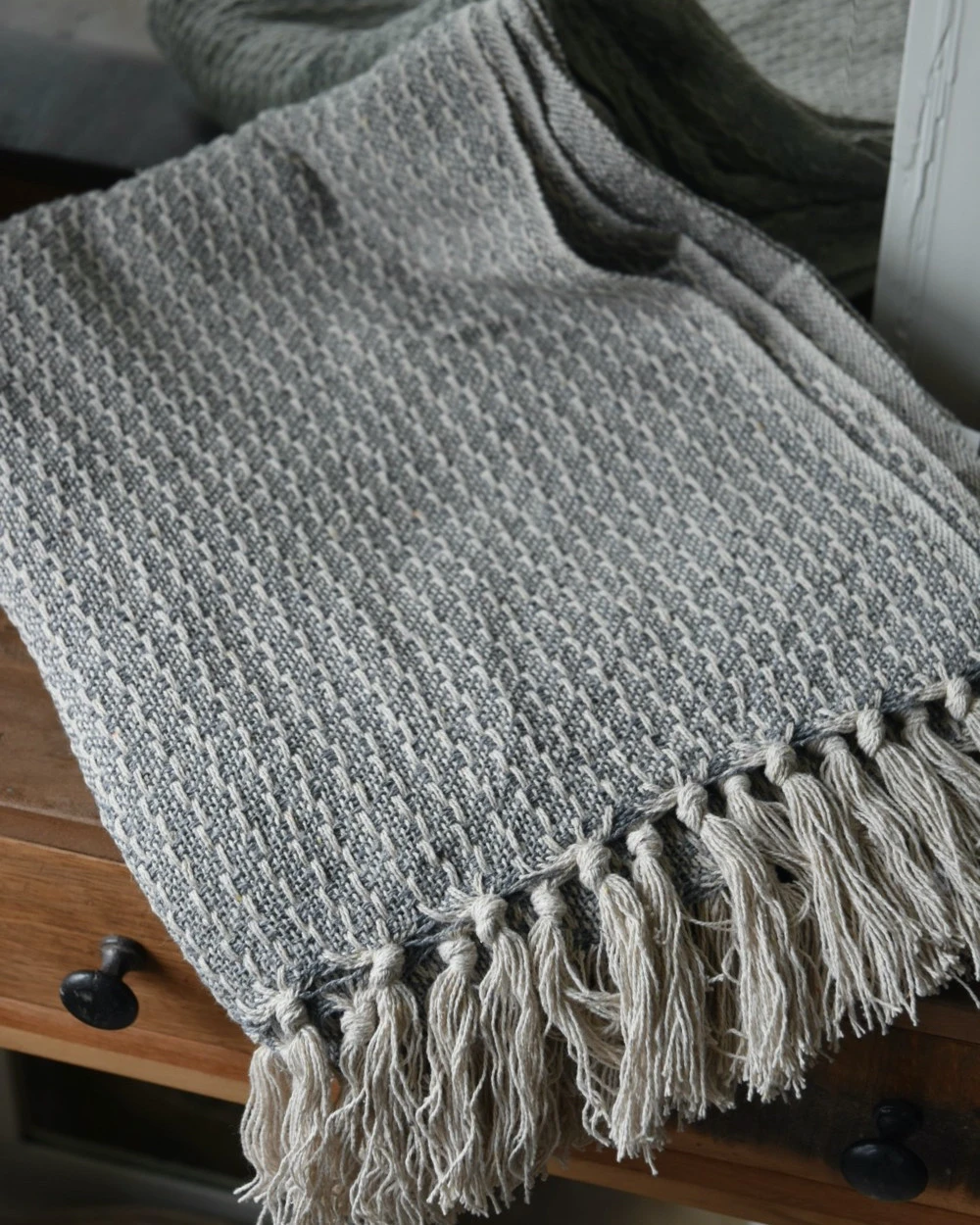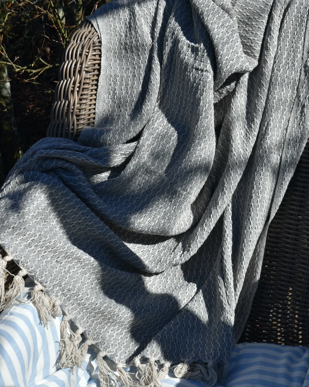 Woonkleed sprei in gebroken wit met zacht blauw/grijs, IB Laursen. Dit prachtige kleed heeft een mooi patroon en is in gebroken wit met een zachte blauw grijze kleur geweven. Aan de boven en onderkant zitten kwastjes als afwerking die het geheel afmaken. U kunt de sprei leuk over een stoel of bank draperen en er eventueel lekker onderkruipen als de avond wat kouder wordt. Ook staat de sprei leuk buiten in combinatie met het matras kussen (altijd binnen opbergen ivm vocht/regen).