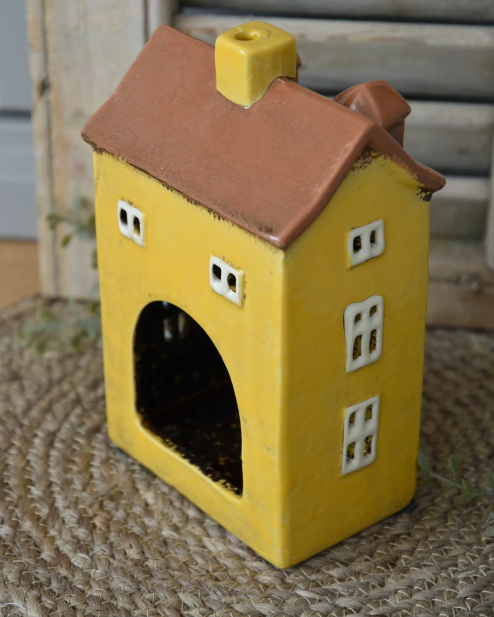 Zonnig geel theelicht pakhuis met dakkapellen Nyhavn, IB Laursen. Dit theelicht pak huis van ceramiek heeft een warm zonnig gele kleur een schoorsteen, twee dakkapellen en heel veel ramen die allemaal open zijn, zodat als u er een kaarsje/waxinelichtje in brand er een mooi warm effect ontstaat. Het pakhuis komt uit de collectie van het Deense merk IB Laursen en vertaald het Deense havenplaatsje Nyhavn met zijn typische kleurrijke pakhuizen. U kunt daarom om zo leuk combineren met alle pakhuizen om zo uw eigen Nyhavn te creëren.