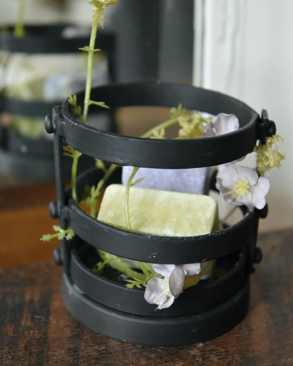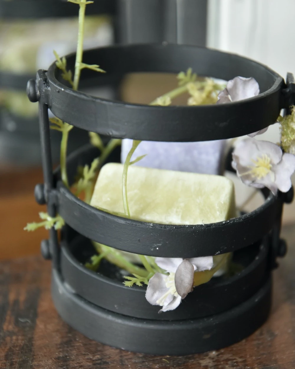 Zwarte metalen houder met Amber blokjes Lavendel en Jasmijn. Deze leuke zwart metalen houder van Brynxz is gevuld met wat groene takjes en bloemetjes en twee Amber blokjes met de geuren Jasmijn en Lavendel. U kunt het geheel zo leuk neerzetten en genieten van de heerlijke geuren. Wanneer de blokjes wat minder gaan ruiken kunt u er een stukje vanaf raspen om zo weer optimaal te genieten van de heerlijke geuren.